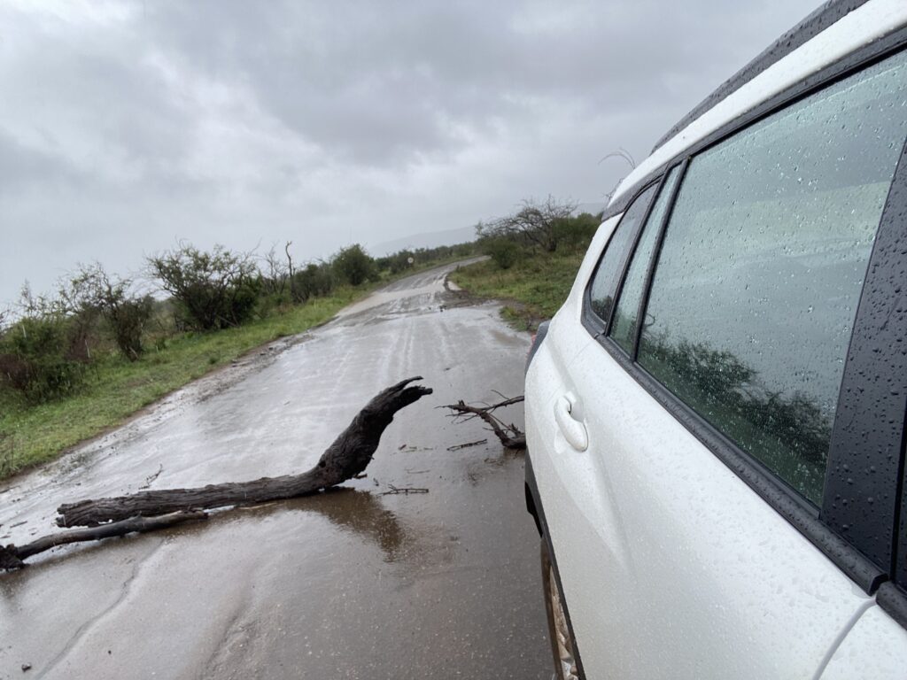 In der Nacht hat es angefangen zu regnen. Ich bin am Morgen noch kurz zur S1 runter, um nach den Hyänen zu schauen. Danach ging es im Regen bis Tshokwane, die Gravels habe ich mir gespart. Außer eine. Nach meinem Frühstück in Tshokwane bog ich in die S35 ein um den Orpen Dam Loop zu fahren. Unterwegs traf ich niemanden an. An der Einmündung zur H10 war die Straße gesperrt. Da ich den aufgeweichten Weg nicht zurück wollte, prüfte ich die Sperrung. Es waren zum Glück nur große Baumäste. Ich prüfte die Umgebung, verließ den Wagen, zog einen schweren Ast zur Seite, fuhr durch und versperrte den Weg wieder. Bis 9:00 Uhr waren alle Sandpisten gesperrt.