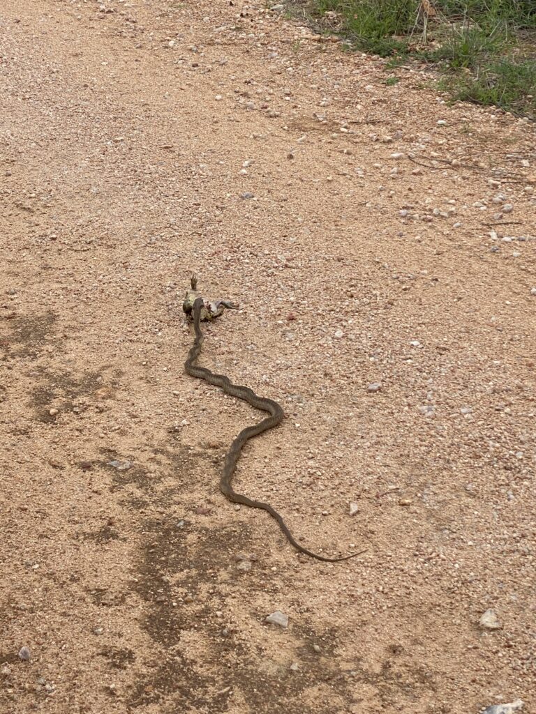 Spuren von den o. G. Gab es genug. Auf der Anfahrt hatte ich eine weibliche Boomslang mit Kröte auf der Straße.