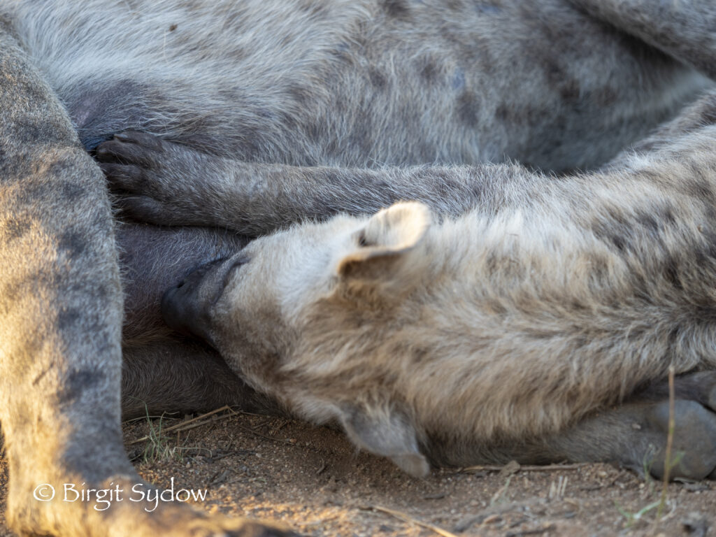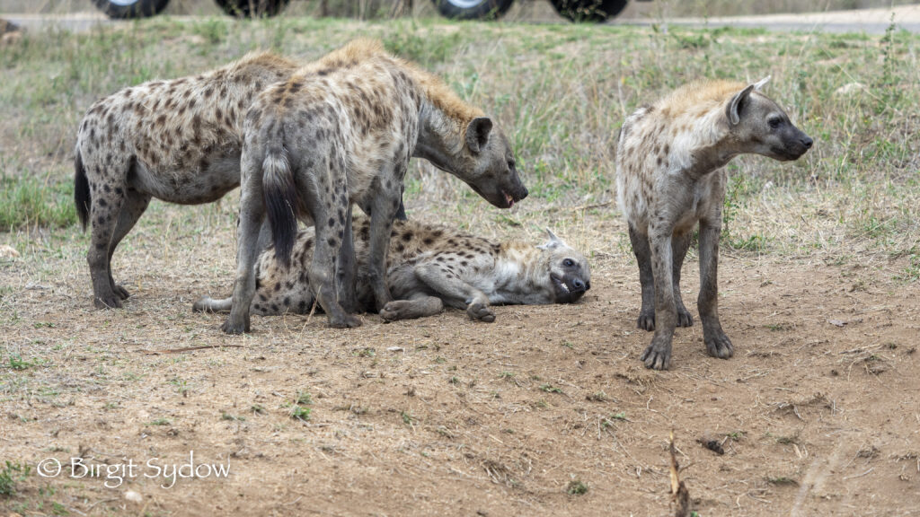 Braai, in der letzten Nacht hat es geregnet. Die S28 war sehr aufgeweicht. Ich hatte diesmal zwei von den drei Brüdern, schlecht zu sehen. Eine junge Hyäne auf der S25