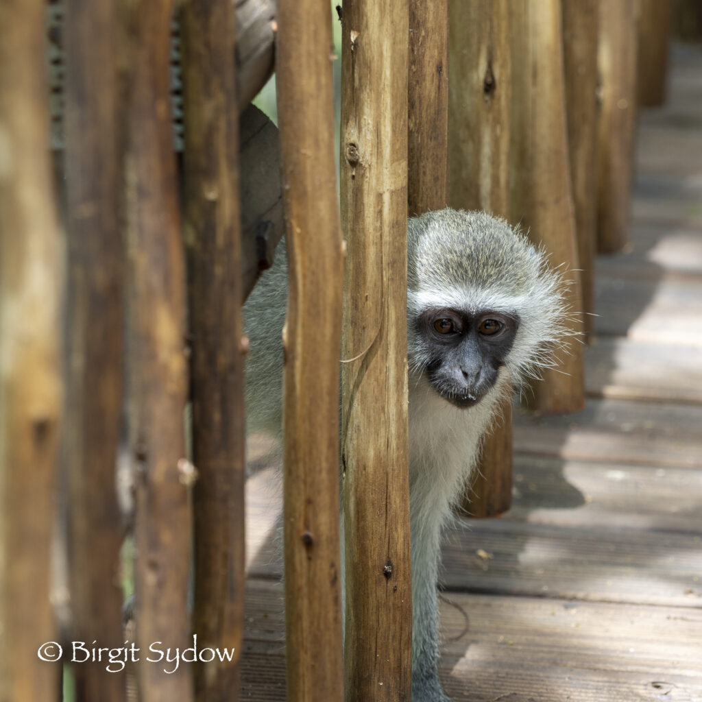Zurück in Satara wollte ich mir etwas die Beine vertreten, da es gerade trocken war und die Sonne raus kam. Die Grünmeerkatzen versuchten gerade ein älteres Ehepaar anzugreifen. Da bin ich natürlich zur Hilfe gekommen und war nun das Opfer des Männchens. Im Augenwinkel sah ich, das eine Grünmeerkätzin ein Baby trug und ein Mann mit einer Schleuder hantierte. Wir zogen uns langsam zurück und gaben ihm und seiner kleinen Familie genug Raum zum flüchten.