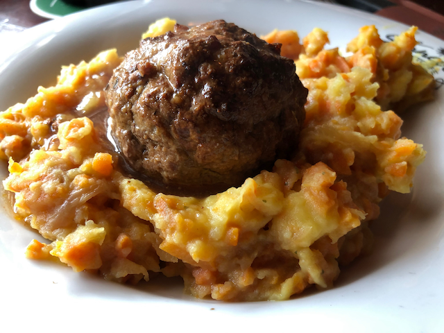 Es begann wieder zu regnen und wir retteten uns in eine Eckkneipe. Da wir einen kleinen Hunger hatten, aßen wir hier zu Mittag. Jannik Spagetti Bolognese und für mich gab es ein typisches niederländisches Mittagessen. Frikadelle mit Möhren-Kartoffelstampf. So Lekker.