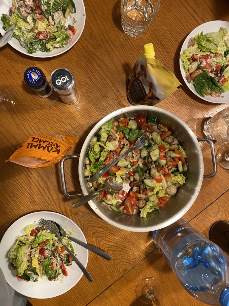 Abends gab es erst eine Runde Zirkeltraining, dann machten wir uns einen Salat und nach einer kleinen Ruhephasen ging es wie am Vortag wieder in die Sauna.