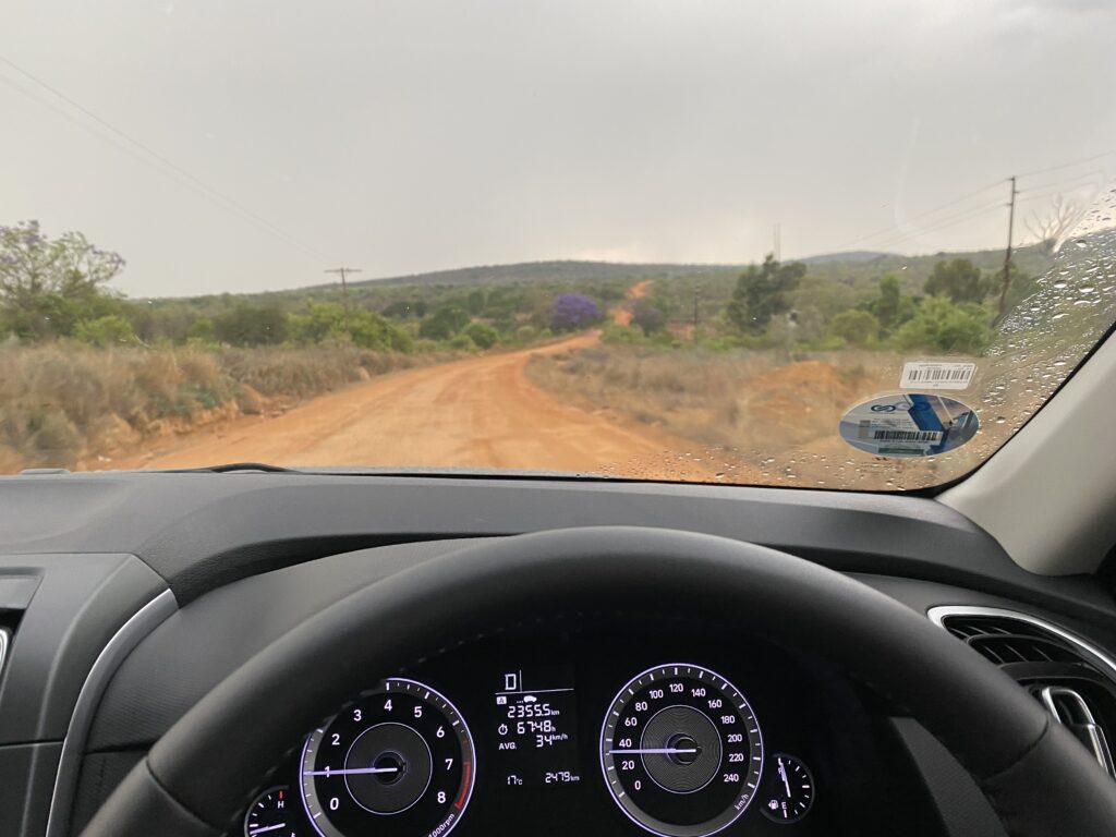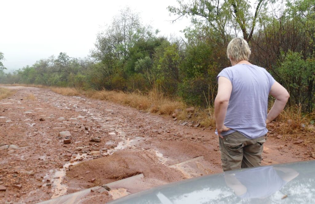 Der Weg von Entabeni und anschließend rechts Richtung Sterkrivier war eine echte Herausforderung. Bei strömenden Regen ging es auf einer seifigen Sandstrecke, mit tiefen Regenrinnen, Geröll, starkem Gefälle oder Anstiegen manchmal mit gerade 20 km/h los. Manchmal musste ich halten um zu checken, ob der Wagen über die Schlaglöcher oder durch die Regenrinnen passte. Nach ca. 25 km erreichten wir wieder eine Teerstraße und es ging über Polokwane zum Phalarborwa Gate.