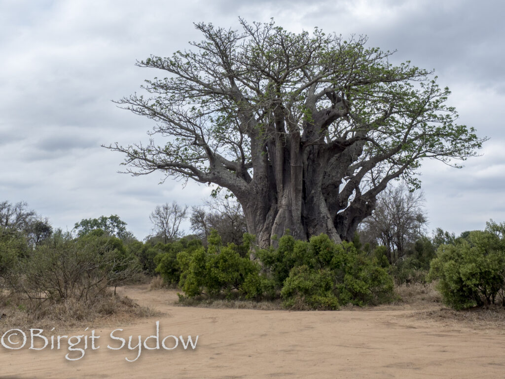 Der mächtige Baobab soll der südlichste Affenbrotbaum im KNP sein, er wird auch als Baum des Lebens bezeichnet. Wir umrundeten mit den Wagen den Baum, auf der anderen Seite war ein kleiner Baum umgeknickt und lag über den Weg, so das wir vorsichtig drumherum und durch eine Herde grasender Impalas fahren mussten.