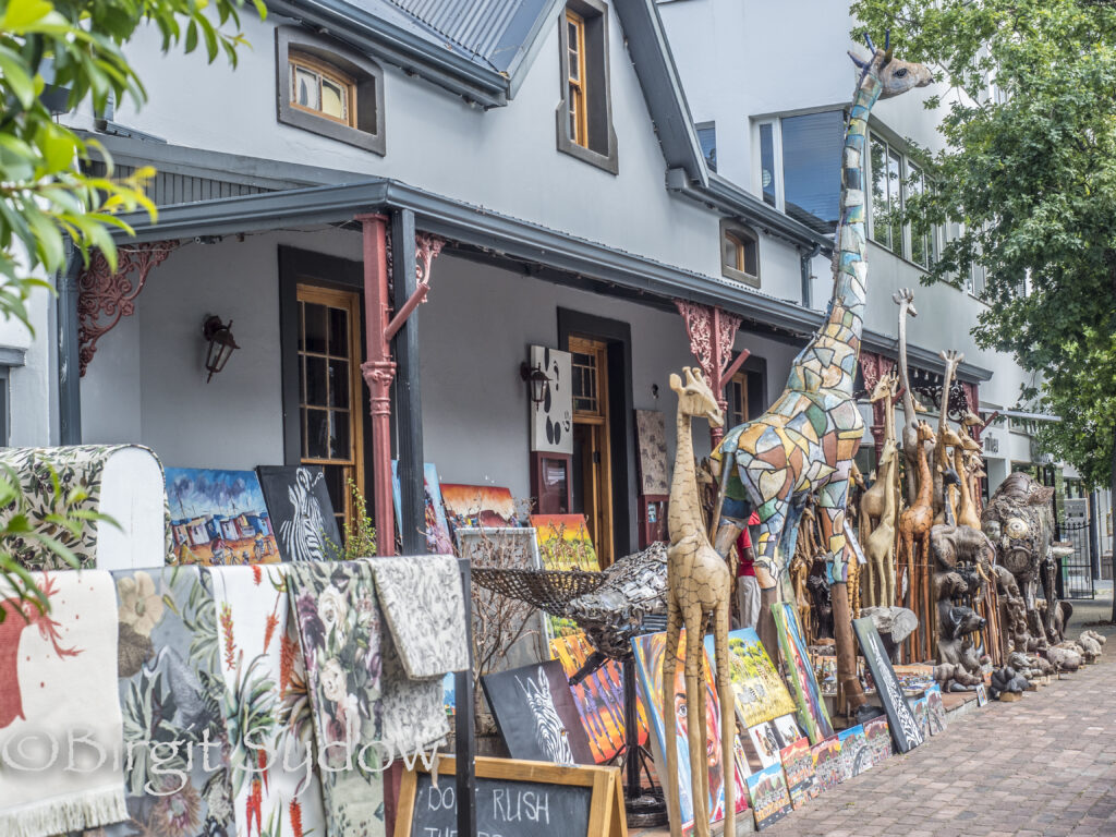 Über die Berge, dem Franschhoek Pass hinunter in die gleichnamige Stadt. Ich hielt an der Hauptstraße, im Kirchenwäldchen fand heute ein Kunsthandwerker-Markt statt. Ich erstand ein Moody-Shirt und eine neue Halskette mit dem afrikanischen Kontinent, gesägt aus einer Münze, als Anhänger. Im Schatten unter alten Bäumen, gönnten wir uns jeweils einen Smoothie.
