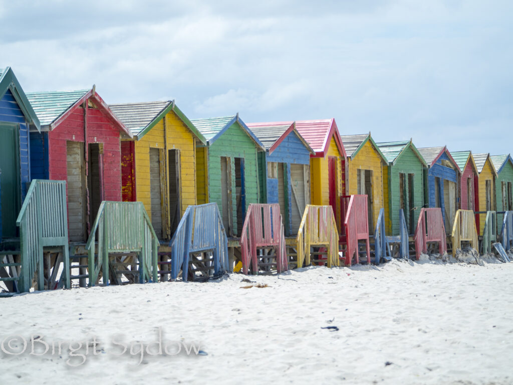 In Muizenberg parkte ich direkt am Strand, hier gingen meine Mitreisenden zu den Strandhäusern, ich wartete am Auto. Nachdem die beiden zurück waren ging ich los. Die ersten Badehäuser scheinen neu gestrichen zu sein und wirkten diesmal, in der Sonne, freundlich. Im Wasser tummelten sich unzählige Surf Schüler.