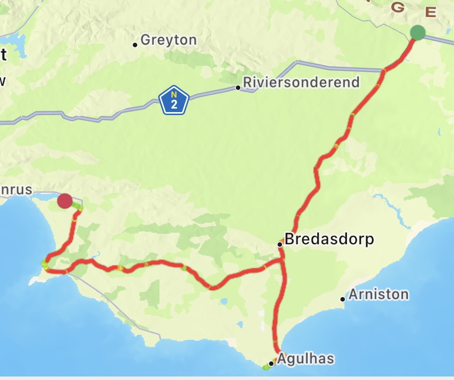 Unser Weg führte uns von Swellendam über die N2, über die R319 vorbei an riesengroßen Feldern, diese waren entweder schon abgeerntet oder die Erntemaschinen und LKWs waren noch bei der Arbeit, bis nach Struis Bay am Indischen Ozean und zum Kap Agulhas. Hier ist geografisch der Ort an dem der Indische Ozean auf dem südlichen Atlantischen Ozean trifft.