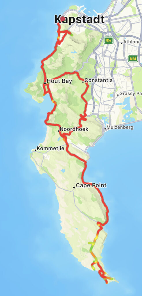 Von Muizenberg ging es – immer an der Küste entlang, begleitet von den Eisenbahnschienen, nach Fishhoek, dann landeinwärts nach Noordhoek und den Chapmans Peak Drive bis nach Hout Bay. Und zum Abschluss zu unserer neuen Unterkunft nach Sea Point.